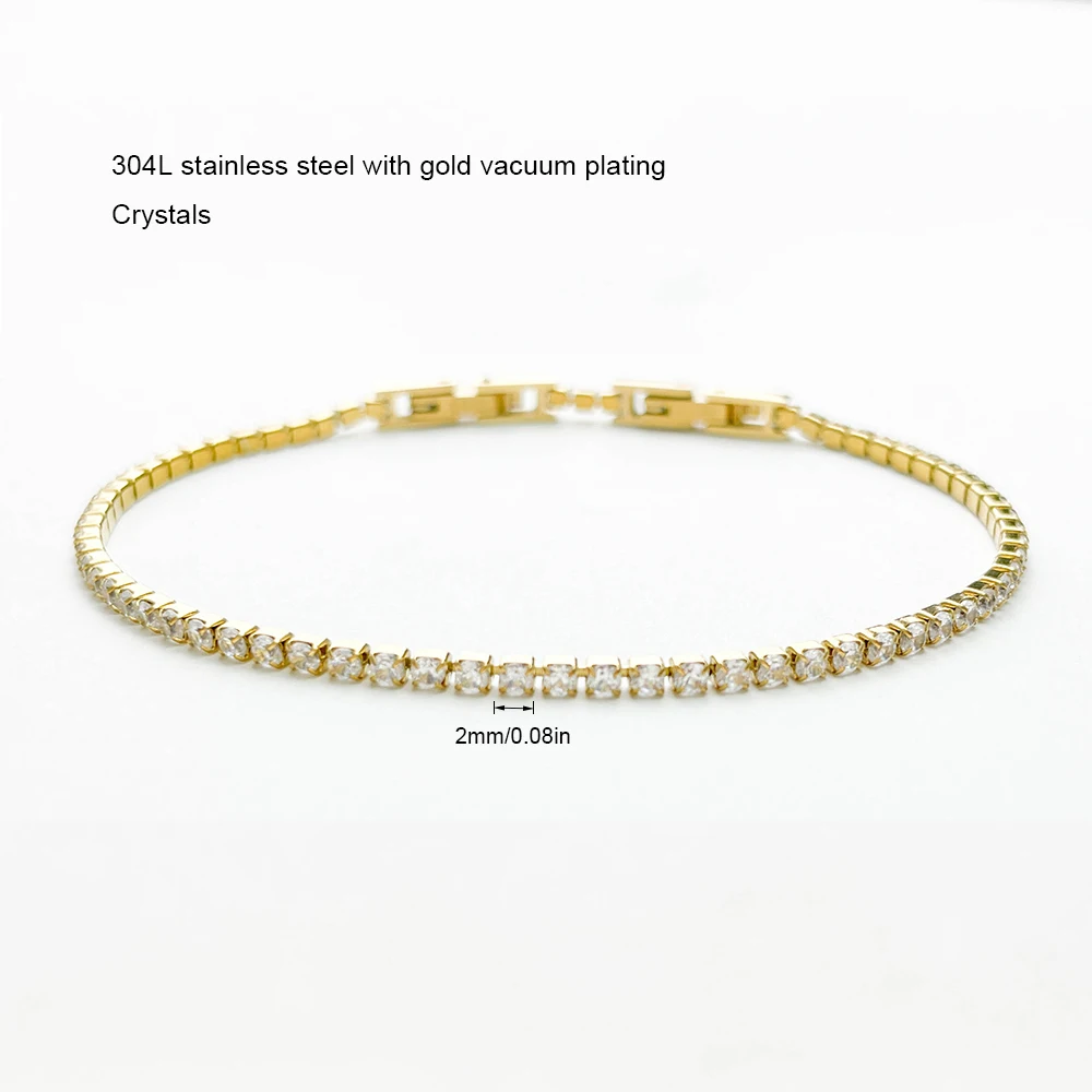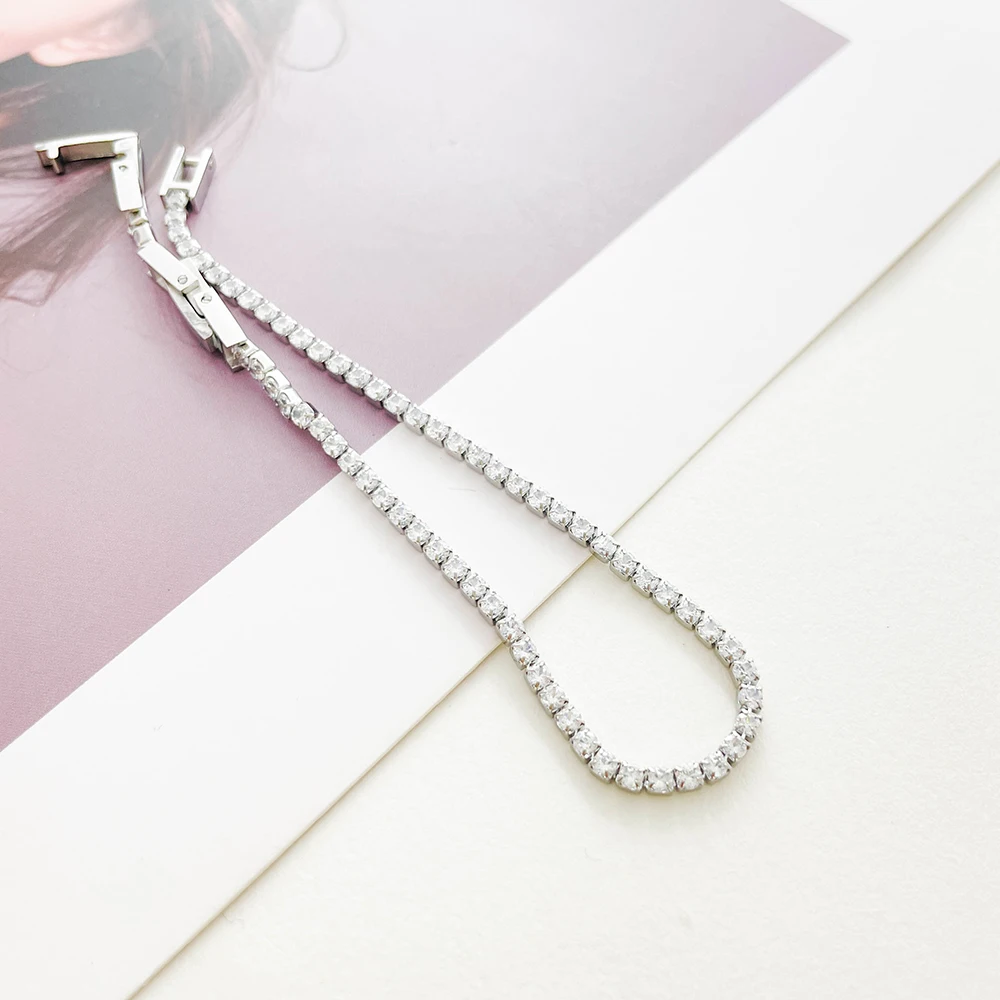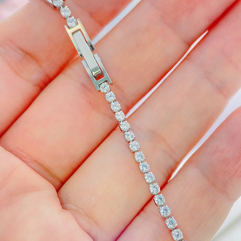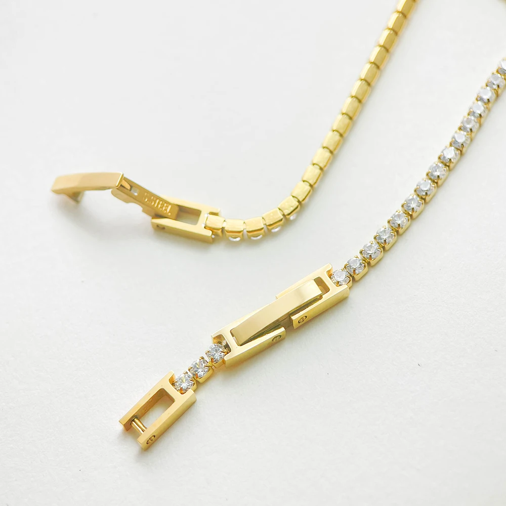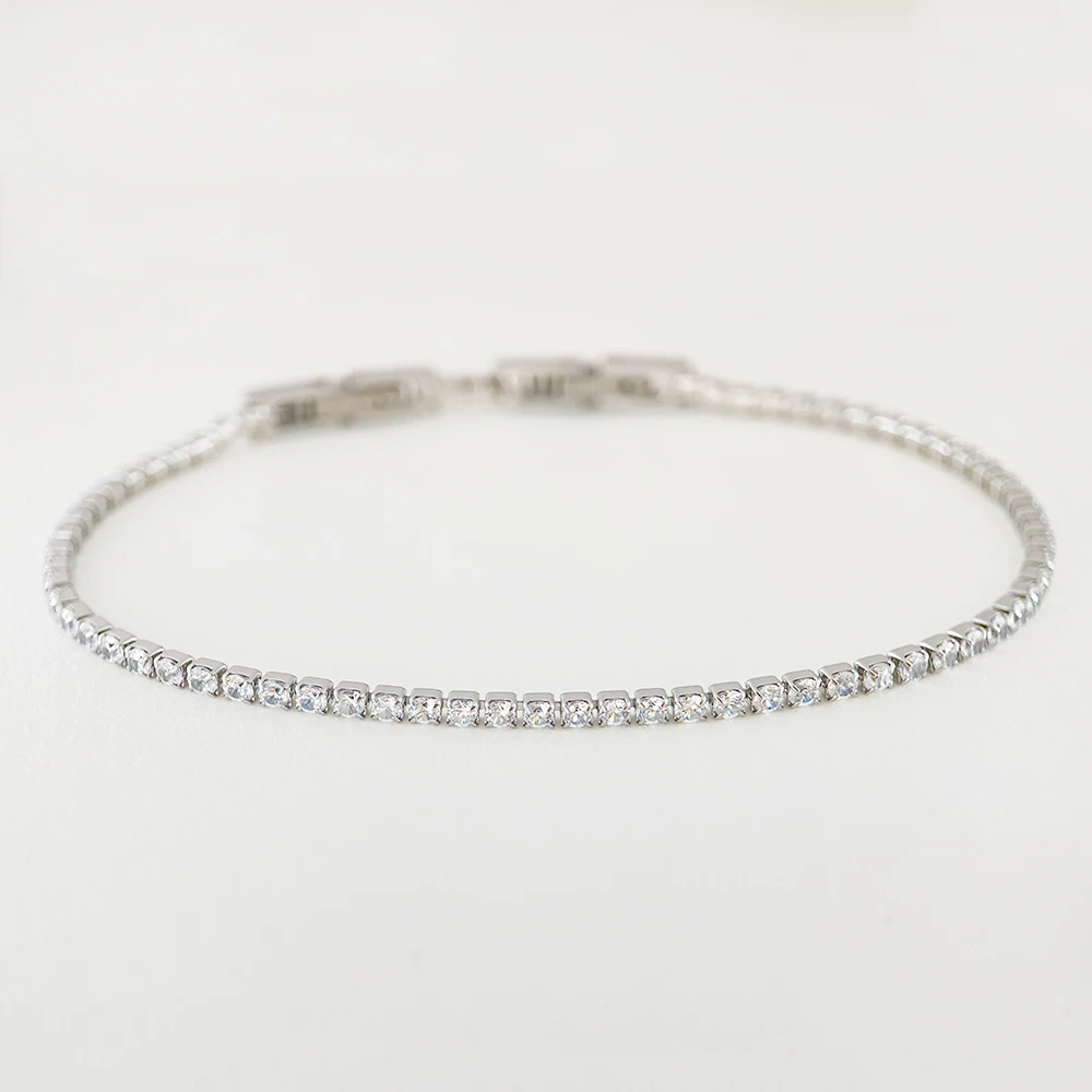 Timeless shine meets modern elegance in the Aurelia Tennis Bracelet, a delicate piece crafted to elevate any look. Featuring a 2mm cluster of brilliant-cut cubic zirconia stones, each link reflects light beautifully, creating a refined sparkle that rivals real diamonds. Made from durable stainless steel, this bracelet is hypoallergenic, non-tarnish, and designed for everyday wear. Available in multiple lengths (13cm, 15cm, 17cm, and 19cm), it ensures the perfect fit for any wrist — from sleek solo wear to layered sophistication. Its minimalist yet luxurious design makes it an ideal piece for friendship gifts, anniversaries, or self-expression jewelry. Whether paired with casual outfits or elegant attire, the Aurelia Tennis Bracelet adds effortless radiance and grace to your style collection.